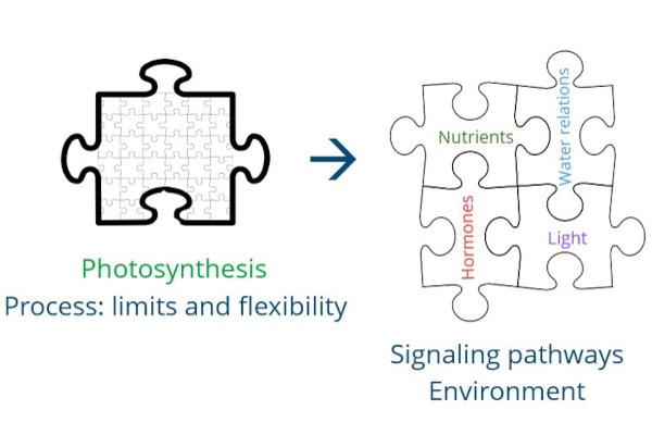 Mein besonderes Interesse gilt Arten, die mehr als einen Photosynthesetyp in einem einzigen Organismus vereinen können (z. B. C3-CAM-, C4-CAM-Pflanzen oder C3-C4-Zwischenformen). Fakultative Pflanzen reagieren extrem schnell, und mein Ziel ist es, die molekularen Mechanismen zu verstehen, die zu ihrer Anpassungsfähigkeit, Signalübertragung, biochemischen Anpassungen und Auslösern beitragen (z. B. Wasser-, Nährstoff- und Lichtverfügbarkeit sowie Wechselwirkungen mit Phytohormonen). Zu diesem Zweck wende ich einen physiologischen und molekularbiologischen Ansatz an und untersuche Regulationsmechanismen auf transkriptioneller, translationaler und posttranslationaler Ebene sowie deren Integration in die Pflanzenphysiologie (Abb. 1).