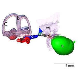 Das Hörvermögen von Fischen basiert primär auf der Wahrnehmung von schallinduzierten Vibrationen der Sagitta (Otolith) und den entsprechenden Auslenkungen der Sinneszilien in der Macula sacculi. Zusätzlich zur direkten Anregung dieser Strukturen haben einige Fischgruppen einen Mechanismus entwickelt, der schallinduzierte Schwimmblasenvibrationen (z. B. über Webersche Gehörknöchelchen) auf die Sagitta überträgt und so ihren hörbaren Frequenzbereich zu höheren Frequenzen erweitert. In Zusammenarbeit mit Dr. Tanja Schulz-Mirbach und Forschern des Paul Scherrer Instituts in der Schweiz untersuchen wir die beteiligten 3D-Strukturen und ihre 4D-Bewegungsmuster in situ (d. h. nativ und im intakten Fischkopf) bei Vertretern der Karpfenartigen (Cypriniformes) und Welsartigen (Siluriformes) mittels Hochgeschwindigkeits-Synchrotron-Tomographie, retrospektiver Gating-Technik und zeitlich aufgelöster Oberflächendarstellung.